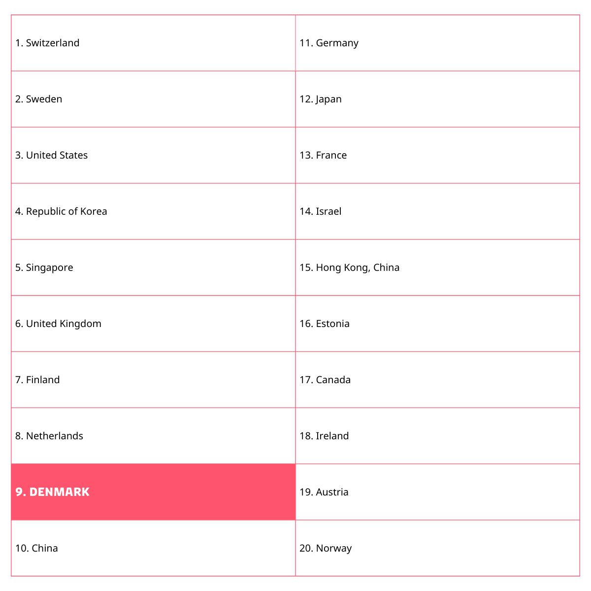 Denmark scores particularly high on parameters related to its general framework conditions conducive to innovation, such as its institutional and regulatory environment, as well as physical and digital infrastructure.