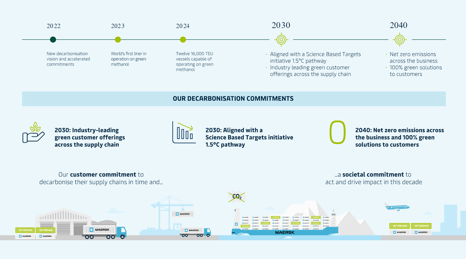 One decade ahead of its initial 2050 ambition, the entire Maersk business has set new aspiring emission targets to achieve net zero greenhouse emissions in 2040. Already by 2030, customers can expect to see industry-leading green offerings and significant emission reductions within the supply chain.
